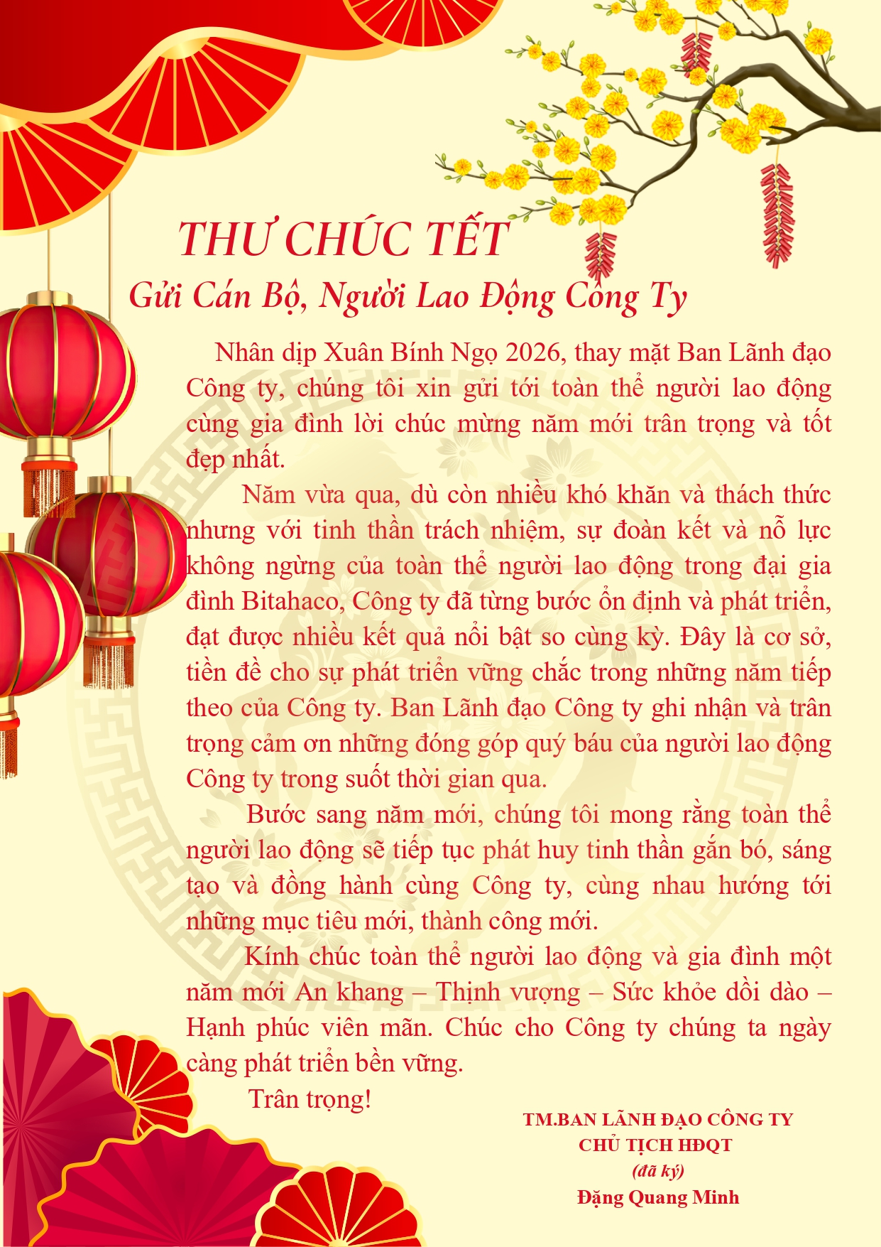 Nhân dịp Xuân Nguyên đán Bính Ngọ 2026, Ban Lãnh đạo Công ty gửi đến toàn thể Cán Bộ, Người Lao Động Công Ty THƯ CHÚC TẾT !
